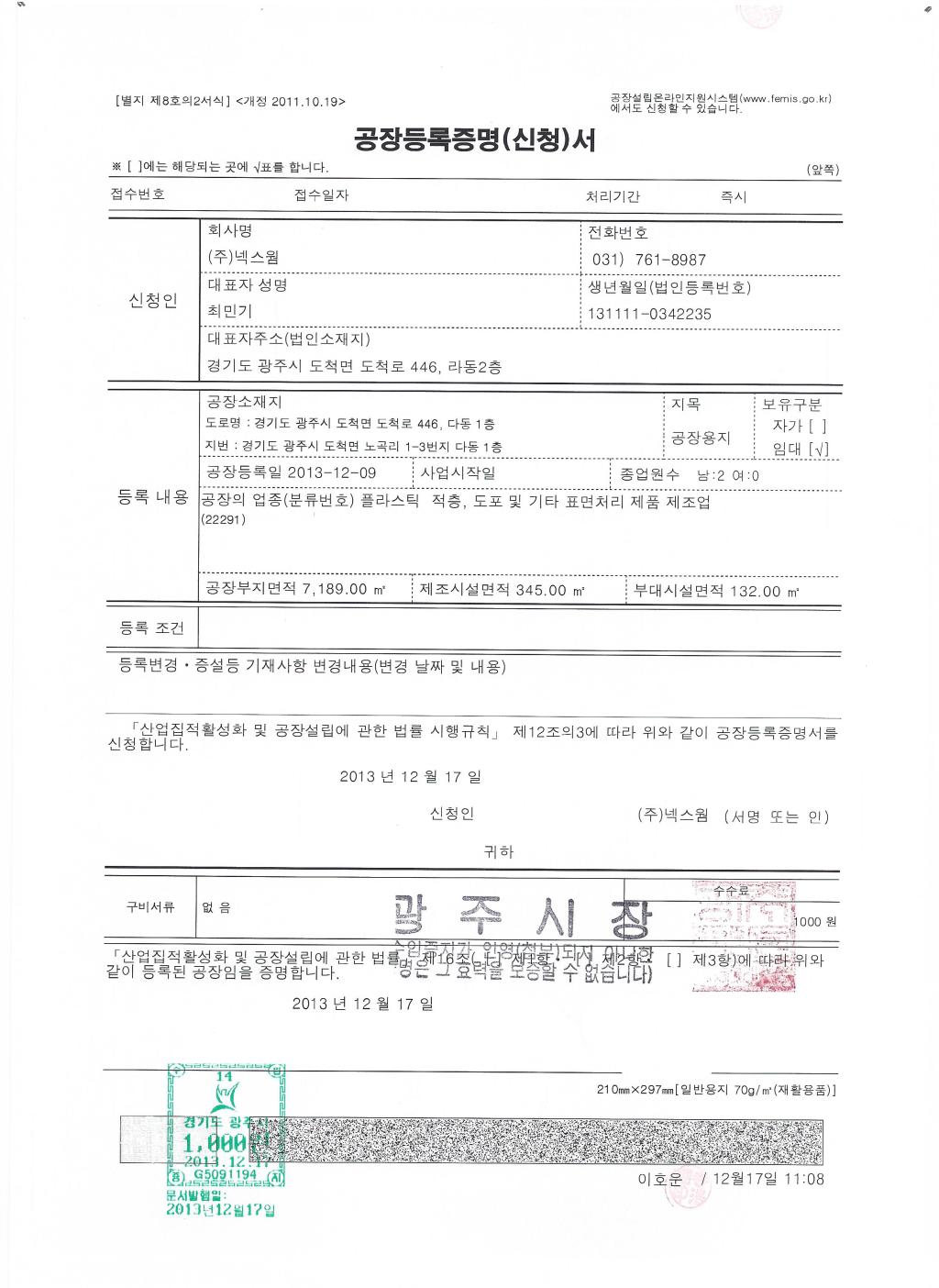 인증서 공장등록증 작성자 관리자 작성일 2017-03-17 04:36 조회 964 좋아요 0 싫어요 0 인쇄 « 나노복합 특허증 ISO9001:2008 인증서 » 목록보기 답글쓰기 Powered by KBoard